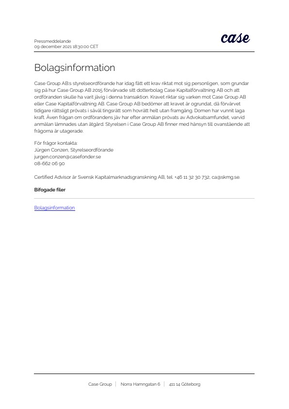 Case Group AB:s styrelseordförande har idag fått ett krav riktat mot sig personligen, som grundar sig på hur Case Group AB 2015 förvärvade sitt dotterbolag Case Kapitalförvaltning AB och att ordföranden skulle ha varit jävig i denna transaktion. Kravet riktar sig varken mot Case Group AB eller Case Kapitalförvaltning AB. Case Group AB bedömer att kravet är ogrundat, då förvärvet tidigare rättsligt prövats i såväl tingsrätt som hovrätt helt utan framgång. Domen har vunnit laga kraft. Även frågan om ordförandens jäv har efter anmälan prövats av Advokatsamfundet, varvid anmälan lämnades utan åtgärd. Styrelsen i Case Group AB finner med hänsyn till ovanstående att frågorna är utagerade.