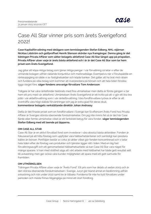 Case Kapitalförvaltning med delägare som tennislegenden Stefan Edberg, NHL-stjärnan Nicklas Lidström och golfproffset Henrik Stenson skördar nya framgångar. Denna gång är det tidningen Privata Affärer som sätter bolagets aktiefond Case All Star längst upp på prispallen. Privata Affärer utser varje år årets bästa aktiefond och i år är det Case All Star som tar hem priset som Årets Sverigefond.
