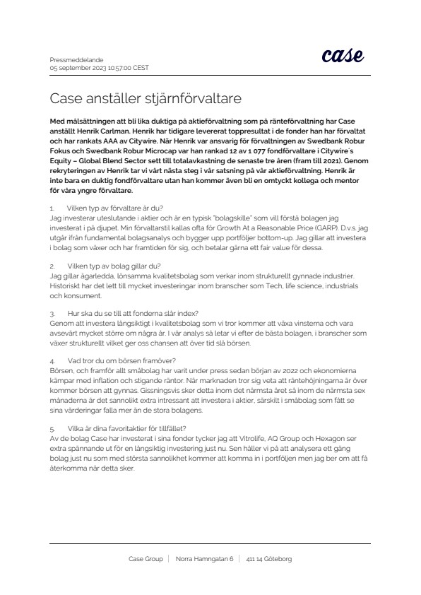 Med målsättningen att bli lika duktiga på aktieförvaltning som på ränteförvaltning har Case anställt Henrik Carlman. Henrik har tidigare levererat toppresultat i de fonder han har förvaltat och har rankats AAA av Citywire. När Henrik var ansvarig för förvaltningen av Swedbank Robur Fokus och Swedbank Robur Microcap var han rankad 12 av 1 077 fondförvaltare i Citywire´s Equity – Global Blend Sector sett till totalavkastning de senaste tre åren (fram till 2021). Genom rekryteringen av Henrik tar vi vårt nästa steg i vår satsning på vår aktieförvaltning. Henrik är inte bara en duktig fondförvaltare utan han kommer även bli en omtyckt kollega och mentor för våra yngre förvaltare.