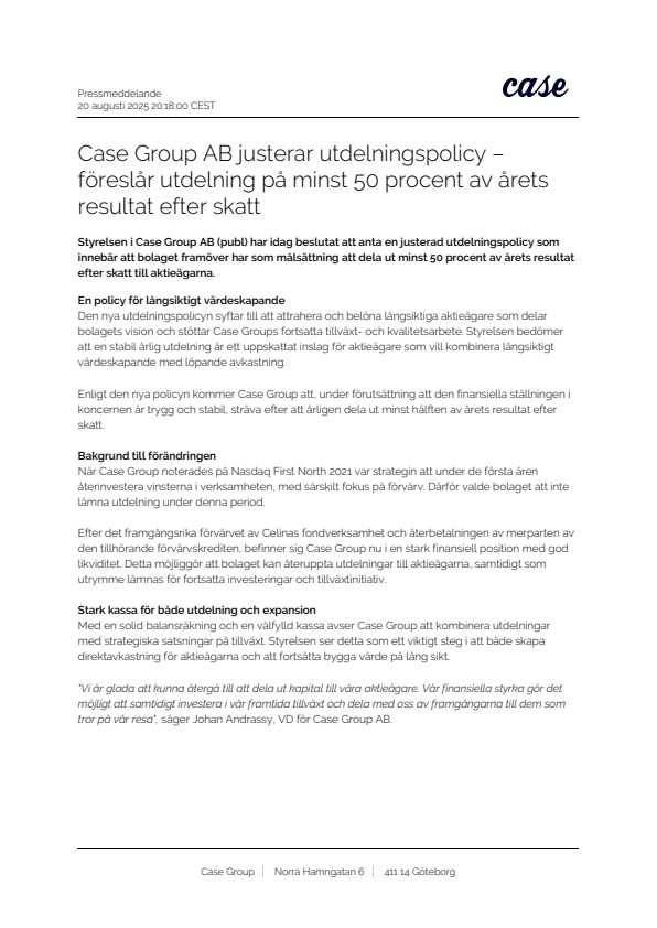 Styrelsen i Case Group AB (publ) har idag beslutat att anta en justerad utdelningspolicy som innebär att bolaget framöver har som målsättning att dela ut minst 50 procent av årets resultat efter skatt till aktieägarna.