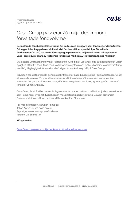 Det noterade fondbolaget Case Group AB (publ), med delägare som tennislegendaren Stefan Edberg och hockeyspelaren Nicklas Lidström, har nått en ny milstolpe. Förvaltade fondvolymer (”AUM”) har nu för första gången passerat 20 miljarder kronor, vilket placerar Case i en exklusiv skara av fristående fondbolag med ett AUM överstigande 20 miljarder.