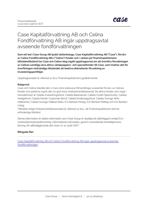 Som ett led i Case Group AB (publ) dotterbolags, Case Kapitalförvaltning AB (”Case”), förvärv av Celina Fondförvaltning AB:s (”Celina”) fonder och i väntan på Finansinspektionens tillträdestillstånd har Case och Celina idag ingått uppdragsavtal om att överföra förvaltningen av Celinas samtliga elva aktiva värdepappers- och specialfonder till Case, som innehar det för överföringen nödvändiga tillståndet att bedriva diskretionär förvaltning av investeringsportföljer.