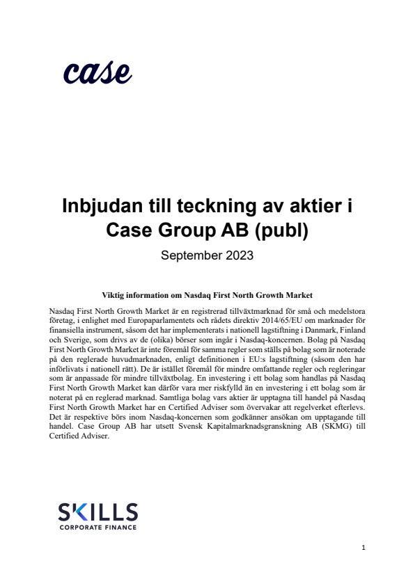 Skills Corporate Finance Nordic AB är finansiell rådgivare till Case i samband med Företrädesemissionen.