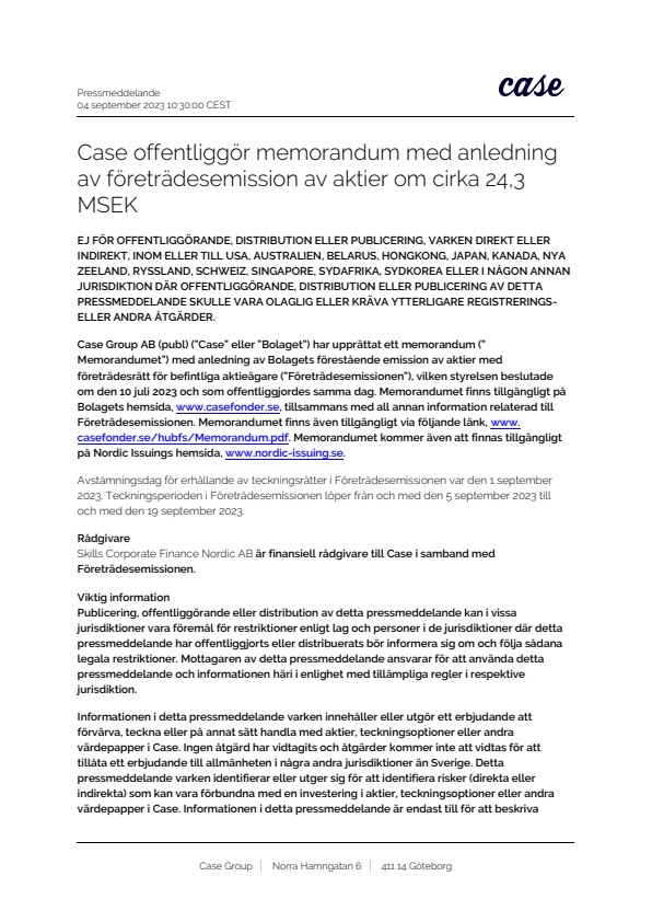 Case Group AB (publ) (”Case” eller ”Bolaget”) har upprättat ett memorandum (”Memorandumet”) med anledning av Bolagets förestående emission av aktier med företrädesrätt för befintliga aktieägare (”Företrädesemissionen”), vilken styrelsen beslutade om den 10 juli 2023 och som offentliggjordes samma dag. Memorandumet finns tillgängligt på Bolagets hemsida, www.casefonder.se, tillsammans med all annan information relaterad till Företrädesemissionen. Memorandumet finns även tillgängligt via följande länk, www.casefonder.se/hubfs/Memorandum.pdf. Memorandumet kommer även att finnas tillgängligt på Nordic Issuings hemsida, www.nordic-issuing.se.