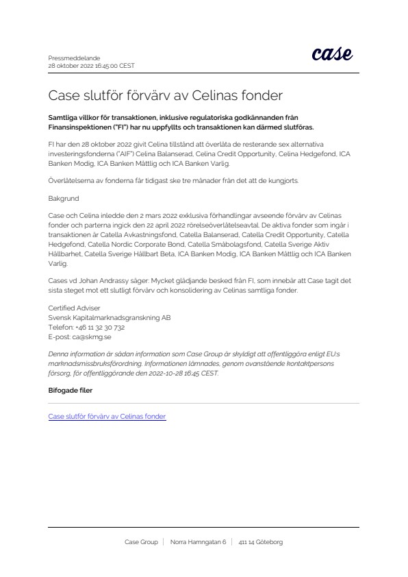 Case och Celina inledde den 2 mars 2022 exklusiva förhandlingar avseende förvärv av Celinas fonder och parterna ingick den 22 april 2022 rörelseöverlåtelseavtal. De aktiva fonder som ingår i transaktionen är Catella Avkastningsfond, Catella Balanserad, Catella Credit Opportunity, Catella Hedgefond, Catella Nordic Corporate Bond, Catella Småbolagsfond, Catella Sverige Aktiv Hållbarhet, Catella Sverige Hållbart Beta, ICA Banken Modig, ICA Banken Måttlig och ICA Banken Varlig.
