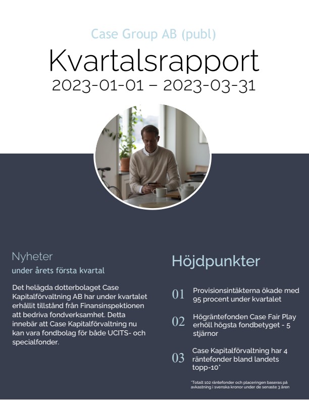 Denna information är sådan information som Case Group är skyldigt att offentliggöra enligt EU:s marknadsmissbruksförordning. Informationen lämnades, genom ovanstående kontaktpersons försorg, för offentliggörande den 2023-05-18 09:00 CEST.