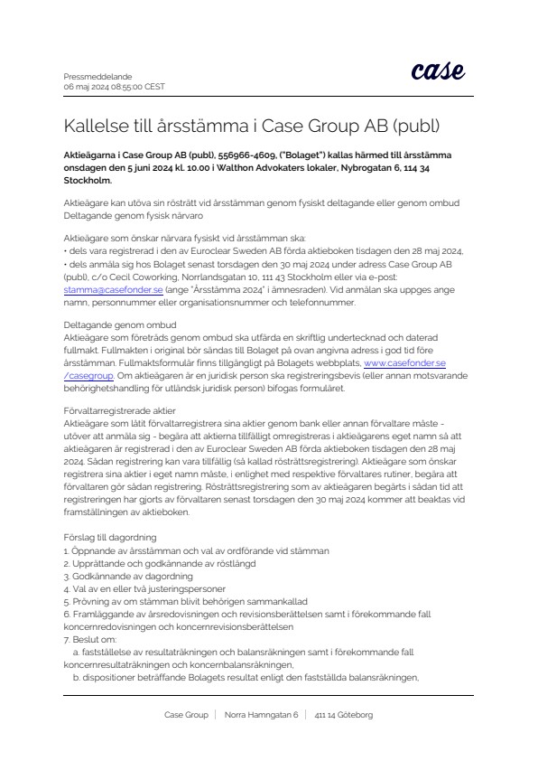 Aktieägarna i Case Group AB (publ), 556966-4609, (”Bolaget”) kallas härmed till årsstämma onsdagen den 5 juni 2024 kl. 10.00 i Walthon Advokaters lokaler, Nybrogatan 6, 114 34 Stockholm.