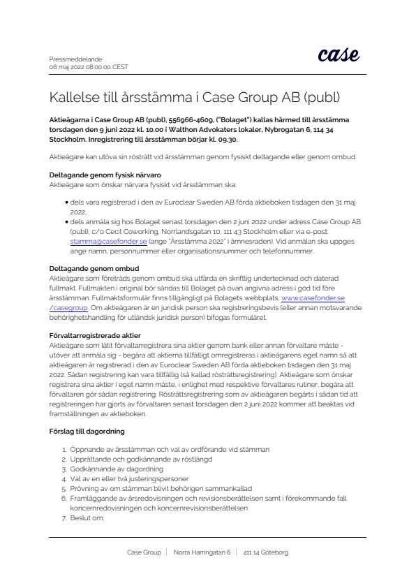 Aktieägarna i Case Group AB (publ), 556966-4609, (”Bolaget”) kallas härmed till årsstämma torsdagen den 9 juni 2022 kl. 10.00 i Walthon Advokaters lokaler, Nybrogatan 6, 114 34 Stockholm. Inregistrering till årsstämman börjar kl. 09.30.