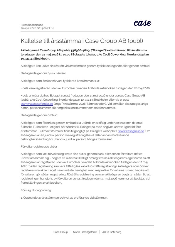 Aktieägarna i Case Group AB (publ), 556966-4609, (”Bolaget”) kallas härmed till årsstämma torsdagen den 21 maj 2026 kl. 10.00 i Bolagets lokaler, c/o Cecil Coworking, Norrlandsgatan 10, 111 43 Stockholm.