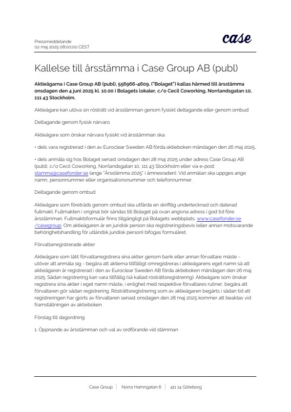Aktieägarna i Case Group AB (publ), 556966-4609, (”Bolaget”) kallas härmed till årsstämma onsdagen den 4 juni 2025 kl. 10.00 i Bolagets lokaler, c/o Cecil Coworking, Norrlandsgatan 10, 111 43 Stockholm.