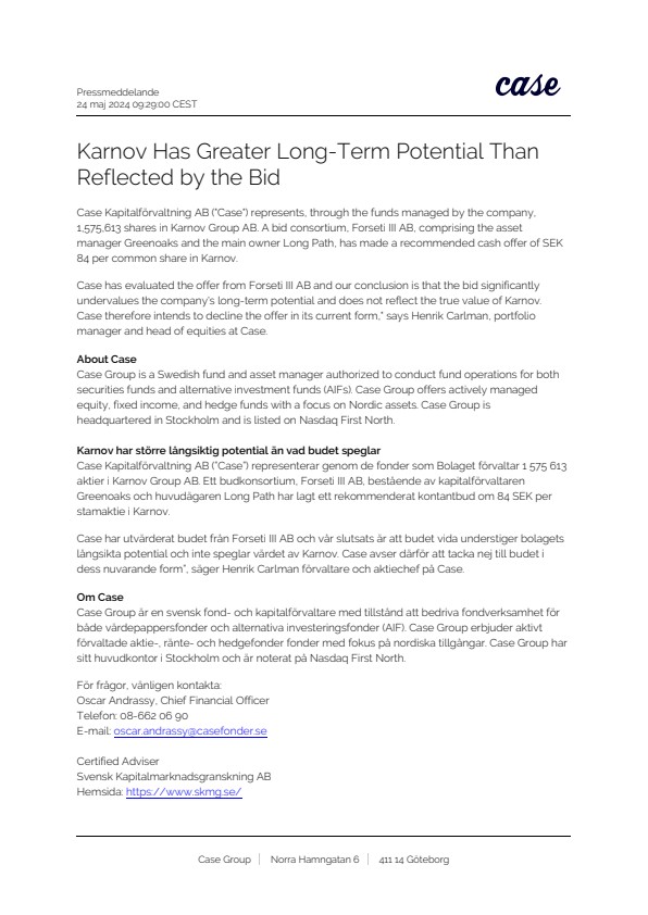 Case Kapitalförvaltning AB (”Case”) representerar genom de fonder som Bolaget förvaltar 1 575 613 aktier i Karnov Group AB. Ett budkonsortium, Forseti III AB, bestående av kapitalförvaltaren Greenoaks och huvudägaren Long Path har lagt ett rekommenderat kontantbud om 84 SEK per stamaktie i Karnov.