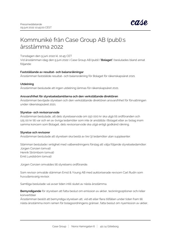 Vid årsstämman idag den 9 juni 2022 i Case Group AB (publ) (”Bolaget”) beslutades bland annat följande:
