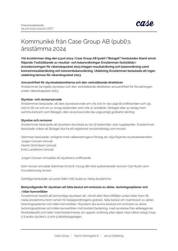 Vid årsstämman idag den 5 juni 2024 i Case Group AB (publ) (”Bolaget”) beslutades bland annat följande: Fastställande av resultat- och balansräkningar Årsstämman fastställde i årsredovisningen för räkenskapsåret 2023 intagen resultaträkning och balansräkning samt koncernresultaträkning och koncernbalansräkning. Utdelning Årsstämman beslutade att ingen utdelning lämnas för räkenskapsåret 2023.