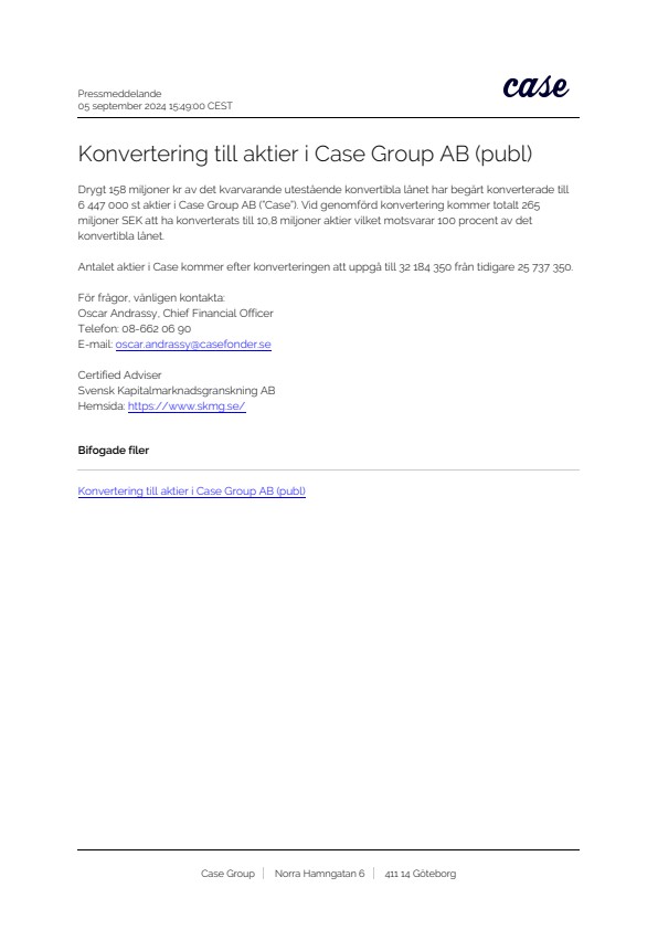 Drygt 158 miljoner kr av det kvarvarande utestående konvertibla lånet har begärt konverterade till 6 447 000 st aktier i Case Group AB (”Case”). Vid genomförd konvertering kommer totalt 265 miljoner SEK att ha konverterats till 10,8 miljoner aktier vilket motsvarar 100 procent av det konvertibla lånet.